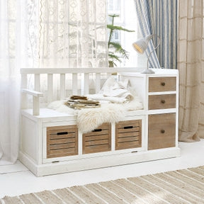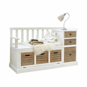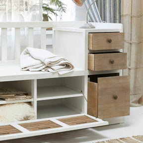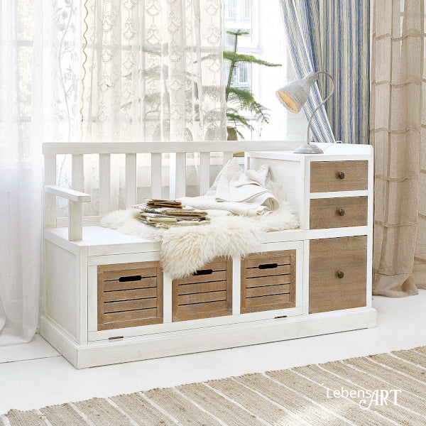 Die Bank ELTON vereint praktische Aufbewahrung mit charmantem Shabby-Chic-Design. Unter der Sitzfläche befindet sich eine große Klappe mit hochwertiger Teak-Holz-Front, die optisch wie drei Schubladen wirkt. Auf der rechten Seite bieten drei echte Schubladen sowie eine großzügige Ablagefläche Platz für Schuhe, kleine Utensilien oder Alltagsgegenstände.