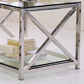 Glas, Edelstahl und ein schlankes Design: Der STAMFORD Beistelltisch überzeugt durch seine zeitlose Eleganz. Zwei robuste Glasplatten fügen sich harmonisch in ein stabiles Edelstahlgestell mit silberfarbenem Finish. Die charakteristischen Kreuzstreben verstärken den klassischen Look und verleihen dem Tisch zusätzliche Stabilität.