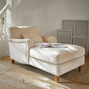 Die Chaiselongue ISA verbindet französische Eleganz mit modernem Wohlfühlkomfort. Ihr samtweicher Bezug in Creme schmeichelt der Haut und lädt dazu ein, sich entspannt zurückzulehnen oder die Füße hochzulegen. Das beiliegende Zierkissen verstärkt den luxuriösen Komfort und sorgt für stilvolle Akzente.