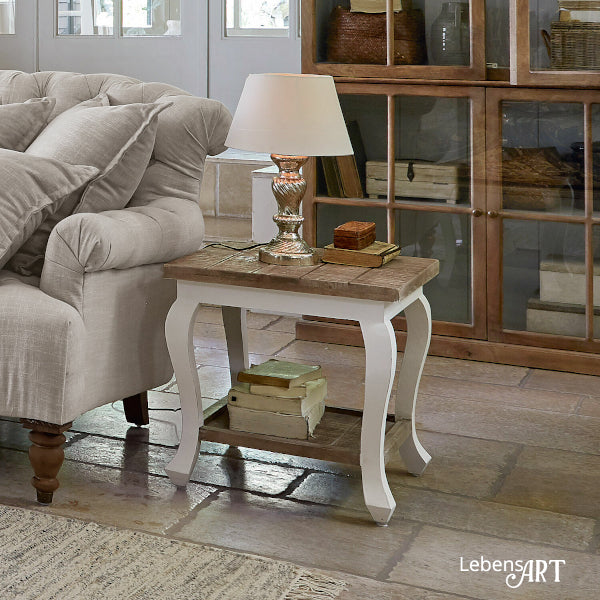 Neben der oberen Stellfläche bietet eine zusätzliche Ablage Platz für Bücher, Zeitschriften oder kleine Alltagsgegenstände. Dank seiner quadratischen Form und kompakten Größe eignet er sich ideal als Beistelltisch neben Sofa oder Sessel, macht aber auch als dekorativer Couchtisch im Zentrum des Raumes eine hervorragende Figur.