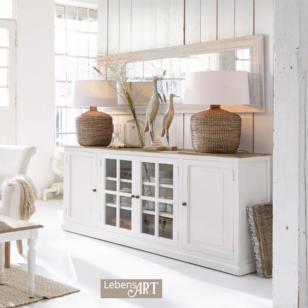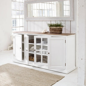 Die Kommode KOSTAN vereint nostalgischen Landhaus-Charme mit hoher Funktionalität. Gefertigt aus edlem Mangoholz und MDF, bietet sie großzügigen Stauraum: Hinter den zwei Holztüren und zwei Glastüren verbergen sich sechs herausnehmbare Einlegeböden, ideal zum Ordnen von Alltagsgegenständen, Geschirr oder Dekoration.