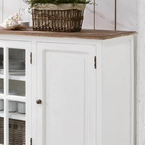 Die klassischen, kassettierten Holztüren und der traditionelle Sprossen-Look der Glastüren ergänzen sich harmonisch mit den dekorativen Knebelgriffen aus Messing. Der warme Naturton des Mangoholzes kontrastiert elegant mit dem strahlenden Weiß des Korpus und verleiht der Kommode eine zeitlose Ausstrahlung.