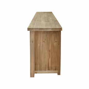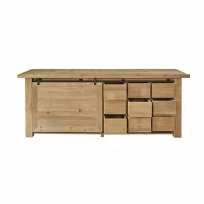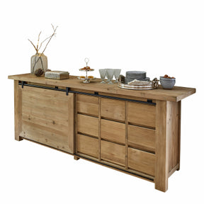 Das großzügige Design bietet reichlich Stauraum: Insgesamt neun Schubladen mit griffigen Mulden aus Eisen sorgen für Ordnung, während die seitliche Schiebetür mit stabiler Eisenführung zwei weitere Fächer freigibt. Ob im Esszimmer für Geschirr und Tischwäsche, im Schlafzimmer für Kleidung oder im Wohnbereich für Deko und Alltägliches – diese Kommode überzeugt in jedem Raum durch ihre Vielseitigkeit.