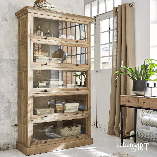 Die verglasten Klapptüren lassen sich elegant im Korpus versenken und geben den Blick auf die fünf geräumigen Fächer frei – ideal für Geschirr, Bücher, Dekoration oder persönliche Schätze. Filigrane Messinggriffe unterstreichen das romantische, klassische Design. Ob in Küche, Esszimmer oder Wohnzimmer: Dieser Schrank setzt stilvolle Akzente und vereint Funktionalität und dekorative Wirkung auf harmonische Weise.
