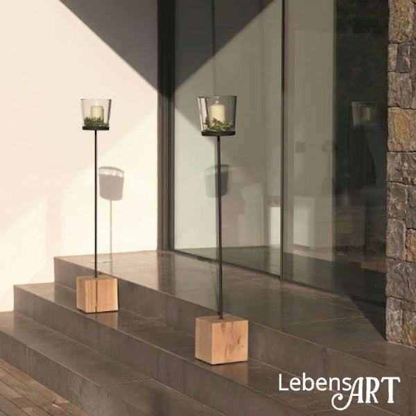 Windlicht Eiche-Fuß natur Glaseinsatz auf Metallteller